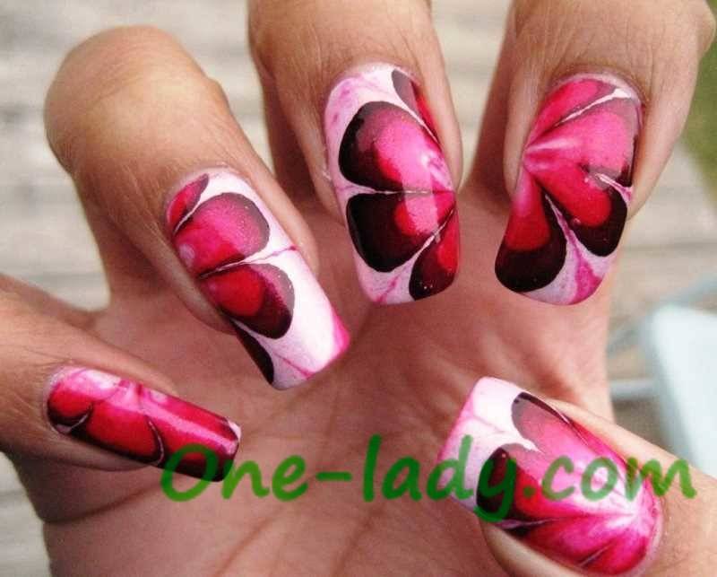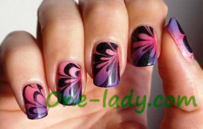 | Водный | Состоит в создании декоративного покрытия или рисунка на поверхности воды. Гель-лаки различных оттенков капаются в стакан воды, смешиваются зубочисткой, переносятся на ноготь при окунании его в воду |