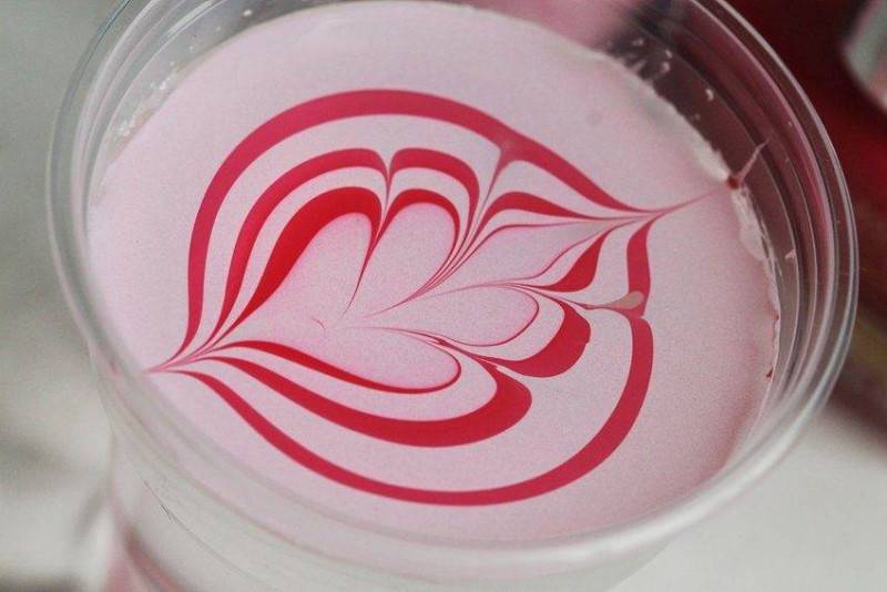 Каждый водяной круг должен растекаться к стенкам стакана. Вы можете помочь этому процессу, проводя зубочисткой от первого развода к бортику емкости. Не погружайте палочку слишком глубоко, она должна скользить по воде.