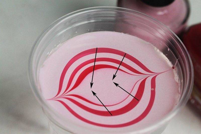 Манипуляцию можно повторить несколько раз. То как растекается краска для ногтей, можно контролировать острым инструментом, иглой или зубочисткой. В итоге должно получиться несколько цветных окружностей. Их рисунок можно менять, ограничиваясь лишь собственной фантазией. Затем нужно опускать ногти в емкость таким образом, чтобы узор оказывался на них. Убрать жирный крем или скотч, удалить излишки лака. Готово