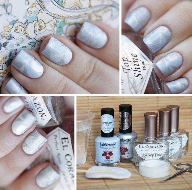 В первую очередь, как и перед нанесением любого маникюра, нужно привести руки в порядок. То есть подравнять ногтевые пластины и удалить кутикулу и возможные заусенцы. После этого необходимо нанести лак – основу. Последний поможет удержать узоры на ногтевой пластине.