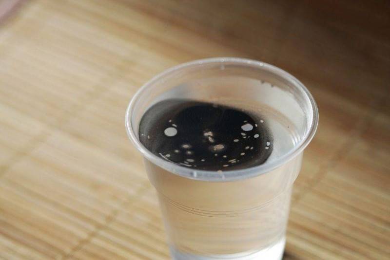 - В емкость наливается вода. Первым лаком, держа кисточку близко к поверхности, нужно поставить каплю.