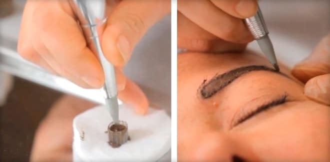 При татуаже бровей волосковым методом косметолог действует примерно так же, как при создании других разновидностей перманентного макияжа: вносит красящий пигмент в кожу при помощи игл ручной манипулы или автоматической татуировальной машинки.