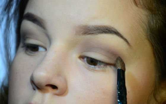 После наносим первый слой темных теней. Его ведем по линии ресниц, также растушевываем. За ним закрашиваем верхнюю часть века, его середину, слегка задевая складку между веком и бровями