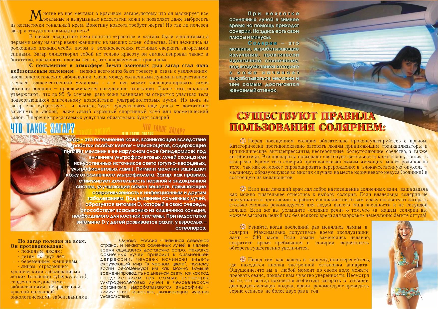 - Что нужно для солярия, чтобы получить самый полезный загар? Загар сам по себе не только не полезен, но и вреден. Потемнение кожи — это ее защитная реакция от ультрафиолета. В соляриях используются UVA-лучи — элемент солнечного спектра, вызывающий преждевременное старение кожи. Их чрезмерные дозы вызывают катастрофические последствия. «Результат может проявиться через 10 лет, — предупреждает врач дермакосметолог Ольга Забненкова, — когда в свои сорок вы будете выглядеть на шестьдесят». Также при особой любви к искусственному «солнцу» формируются стойкие пигментные пятна на переносице, скулах, над верхней губой, расширяются поры, происходит обострение вирусных заболеваний.