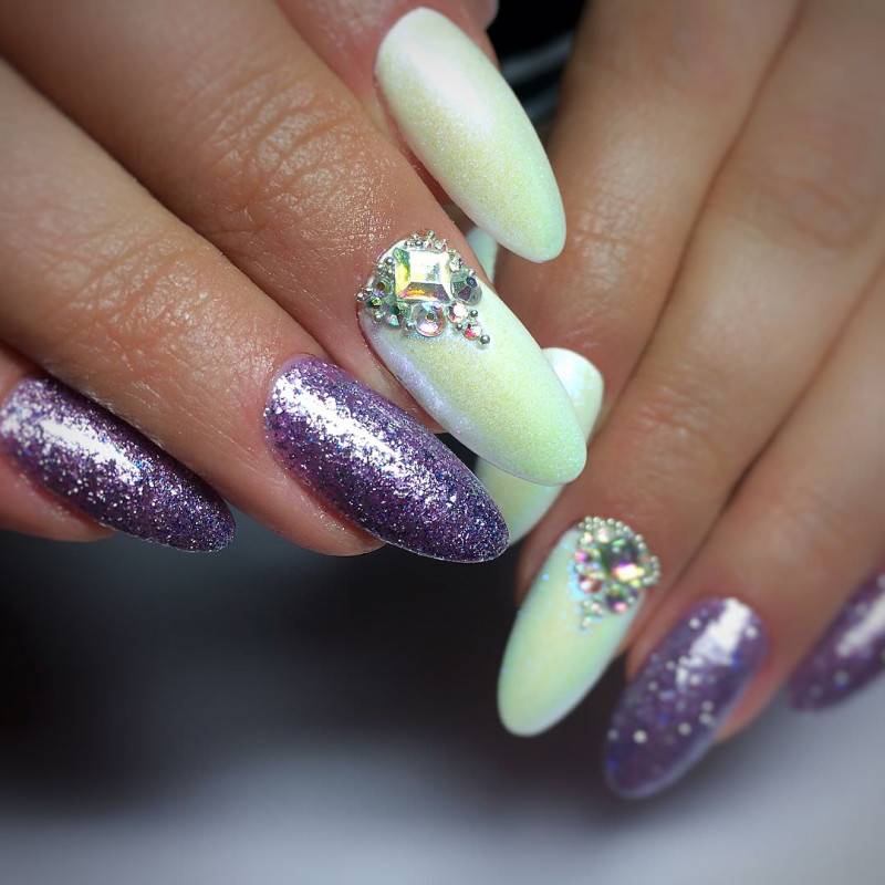 Стразы и блестки – соседство, которое всегда выручало девушек, желающих создать шикарный дизайн ногтей. Разнообразие материала настолько огромно, что каждая модница найдет блестки под себя. Не бойтесь добавлять в свои нейл-арты блестки, стразы и камни. При грамотном исполнении такой маникюр будет выглядеть удивительно красиво и стильно.