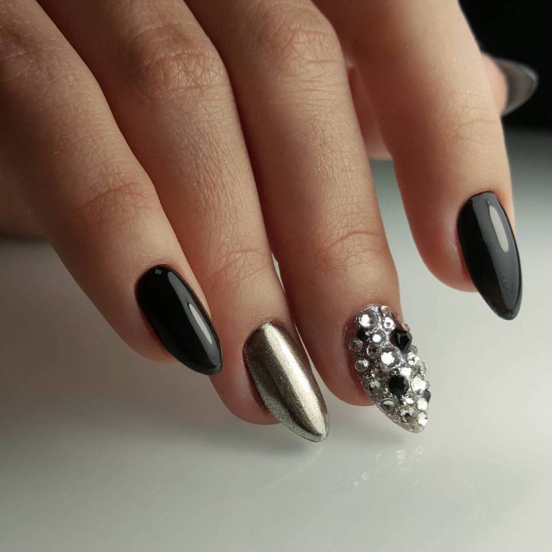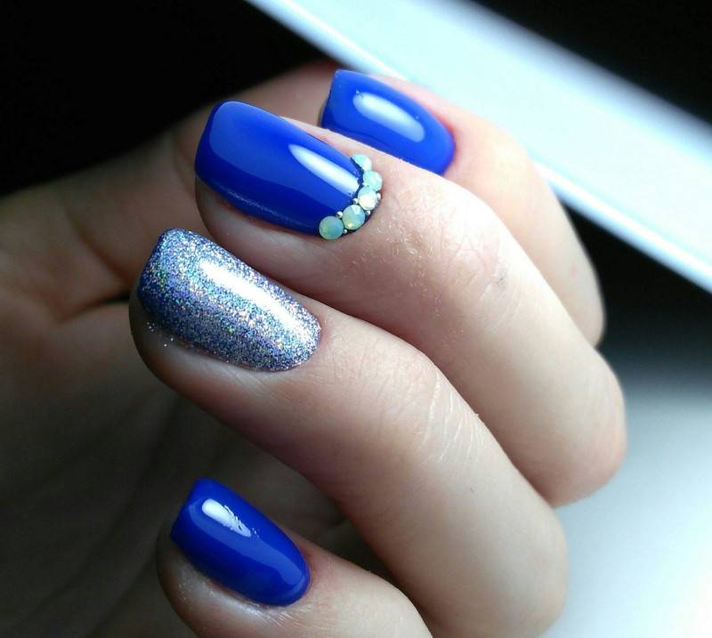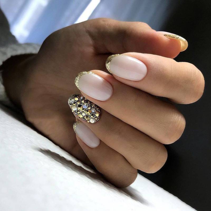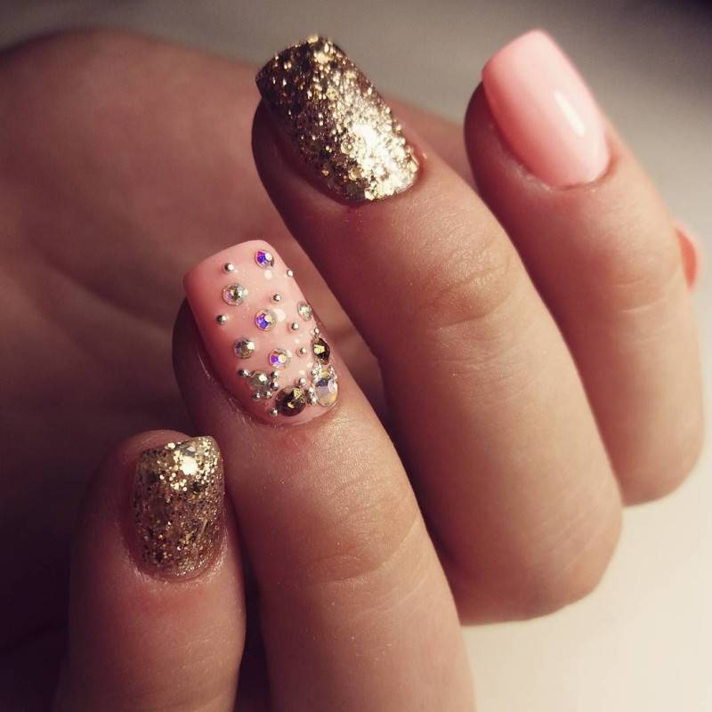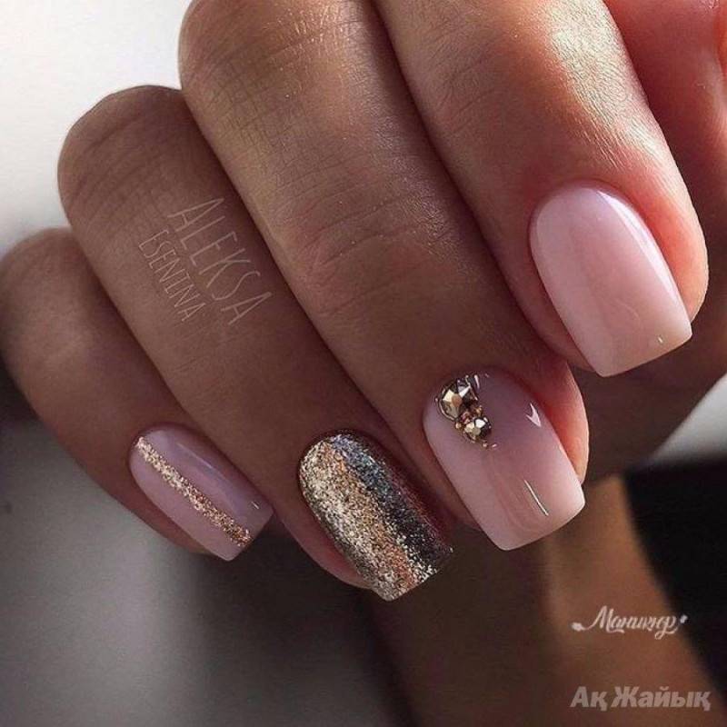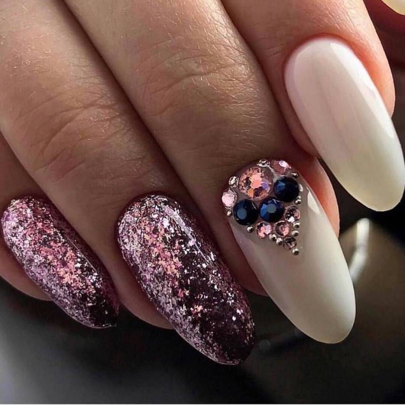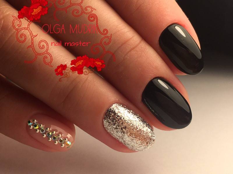 Блестки и стразы — неразлучная пара в маникюре. С их помощью можно создать минималистичный или активный праздничный дизайн ногтей. Чтобы не переборщить с блеском, рекомендуем оформлять стразами один ноготь на руке, а другой полностью покрывать блестками. Остальные ногти лучше оставить без дополнительного декора. такой маникюр будет выглядеть стильно и эффектно, а не пошло и чрезмерно.