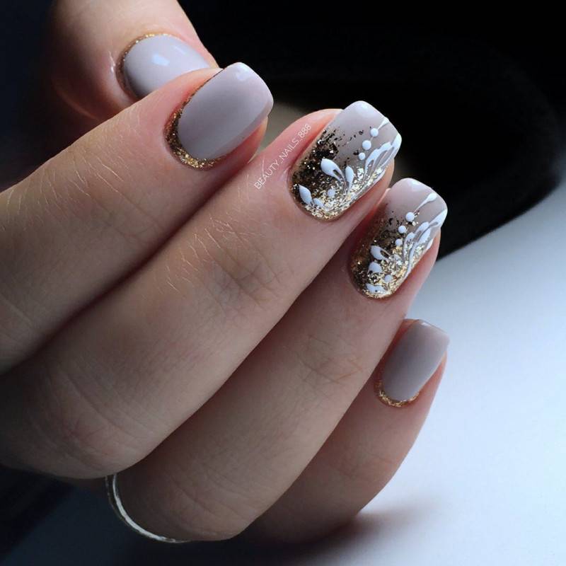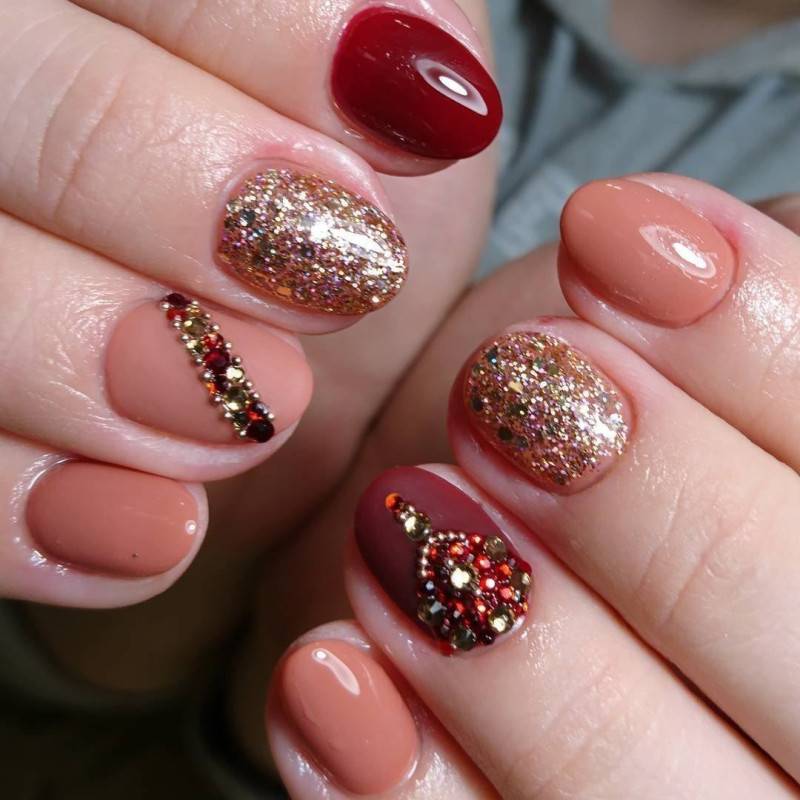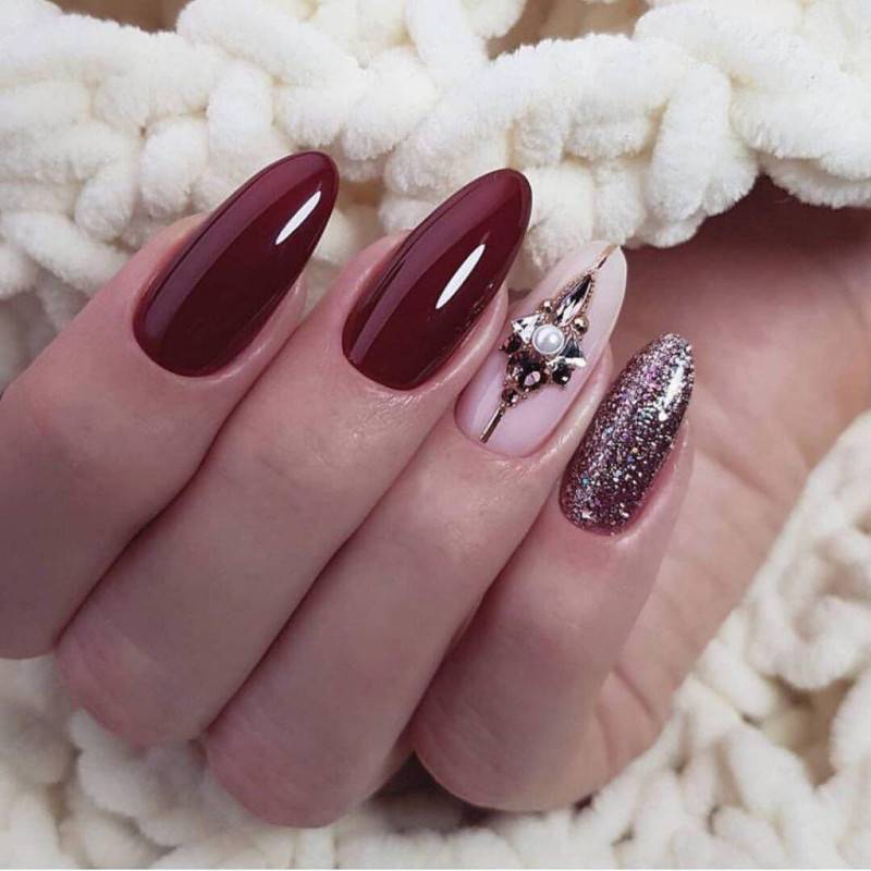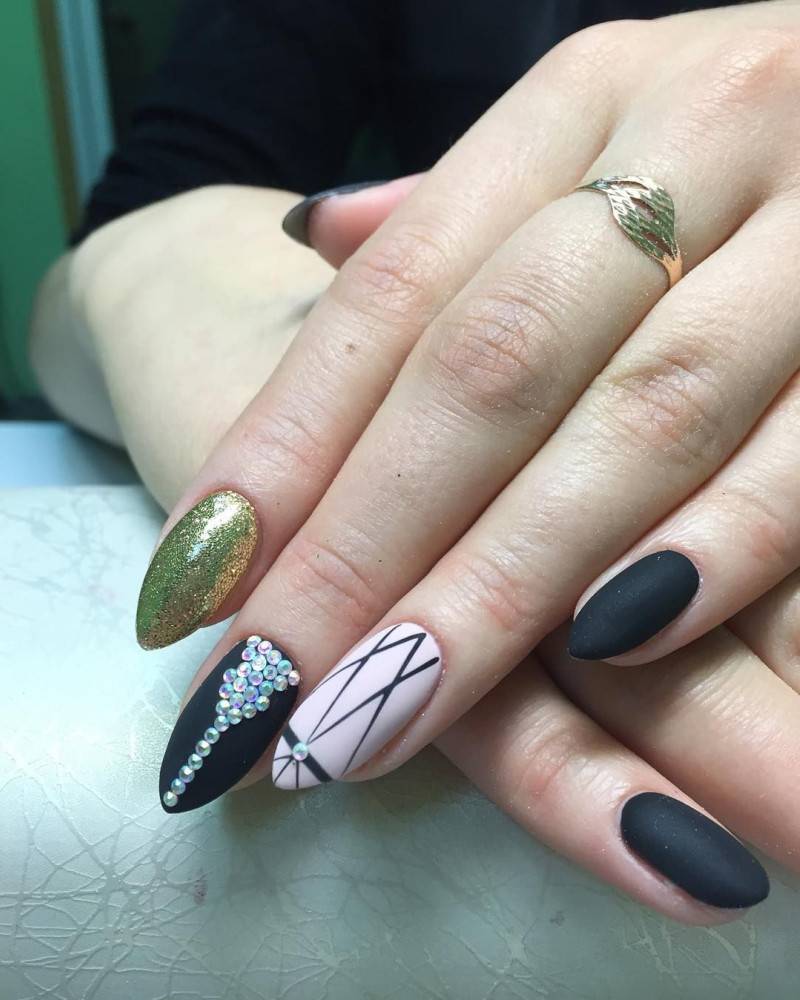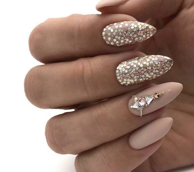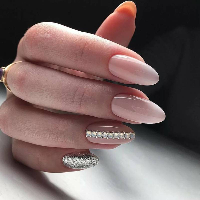 Блестки и стразы — неразлучная пара в маникюре. С их помощью можно создать минималистичный или активный праздничный дизайн ногтей. Чтобы не переборщить с блеском, рекомендуем оформлять стразами один ноготь на руке, а другой полностью покрывать блестками. Остальные ногти лучше оставить без дополнительного декора. такой маникюр будет выглядеть стильно и эффектно, а не пошло и чрезмерно.