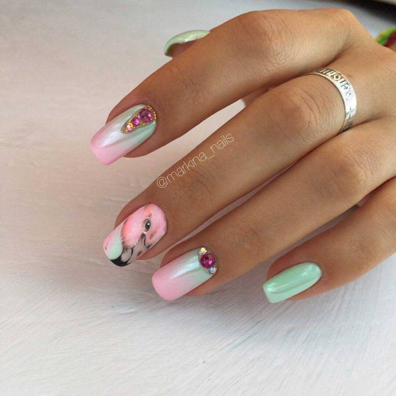 Стразы можно сочетать с любыми рисунками, делая яркие блестящие акценты. Другой вариант — рисунок из страз. Мастер нейл-арта может проявить фантазию и собрать рисунок или использовать трафарет, по которому выложит контур камнями. Такой же прием можно использовать при домашнем маникюре. Какие рисунки особенно актуальны в этом сезоне: