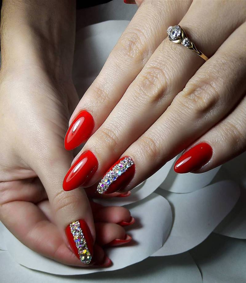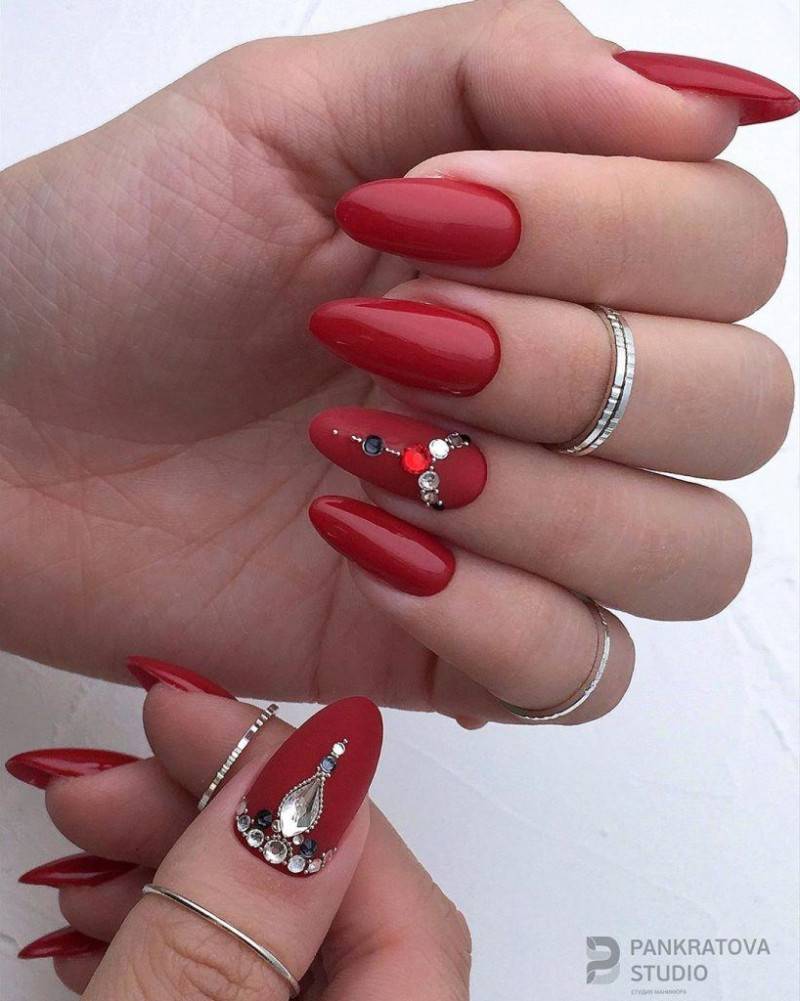 Вариант ниже не совсем подходит для массивной, тяжёлой инкрустации, но также часто применяется для крепления маленьких стразинок с плоским дном. Сегодня на пике популярности яркие цвета лака, такие как красный и розовый. Они отлично сочетаются с любой одеждой и подчеркивают женственность