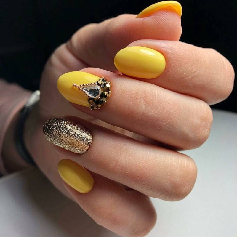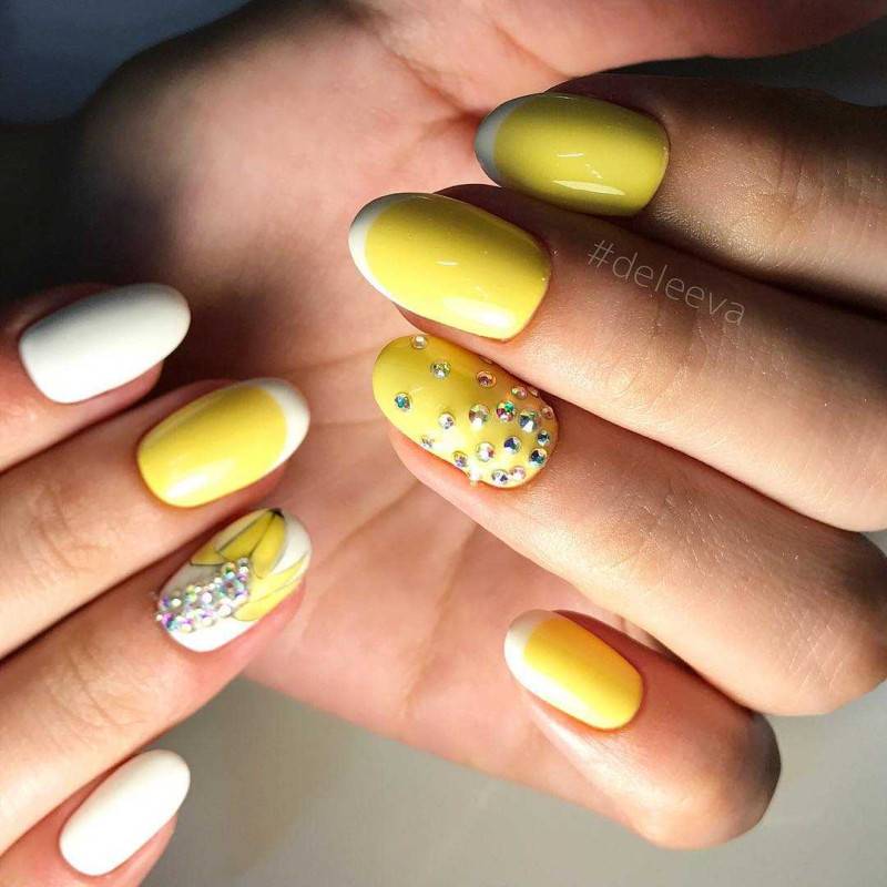 В тренде лимонный, лаймовый, горчичный, алый и другие оттенки, которые заряжают позитивом, вдохновляют девушек, шикарно смотрятся в летних образах. Чтобы смягчить яркость оттенков, нейл-мастера используют матовое покрытие. Яркие оттенки шикарно смотрятся с однотонным покрытием 1-2 ноготков серебряным глиттером, пайетками, кристаллами Пикси, стразами необычной формы. На ярком фоне можно поэкспериментировать и создать эффектный и заметный дизайн, который не всегда получается на светлых пастельных оттенках.