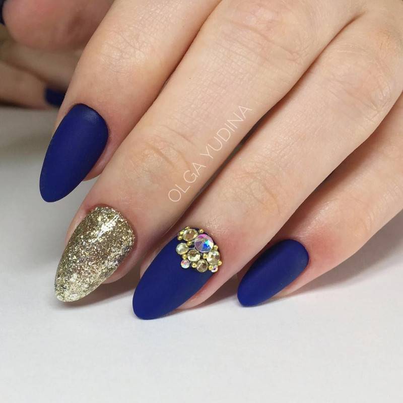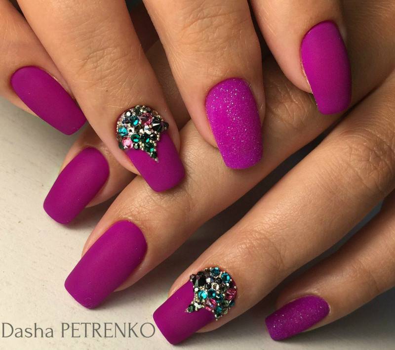 Выразительнее всего матовый маникюр выглядит в темном сочном оттенке — черном, синем, винном, шоколадном. Стразы могут быть контрастными или, наоборот, сочетаться по оттенку с цветом ноготка.