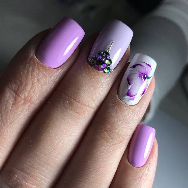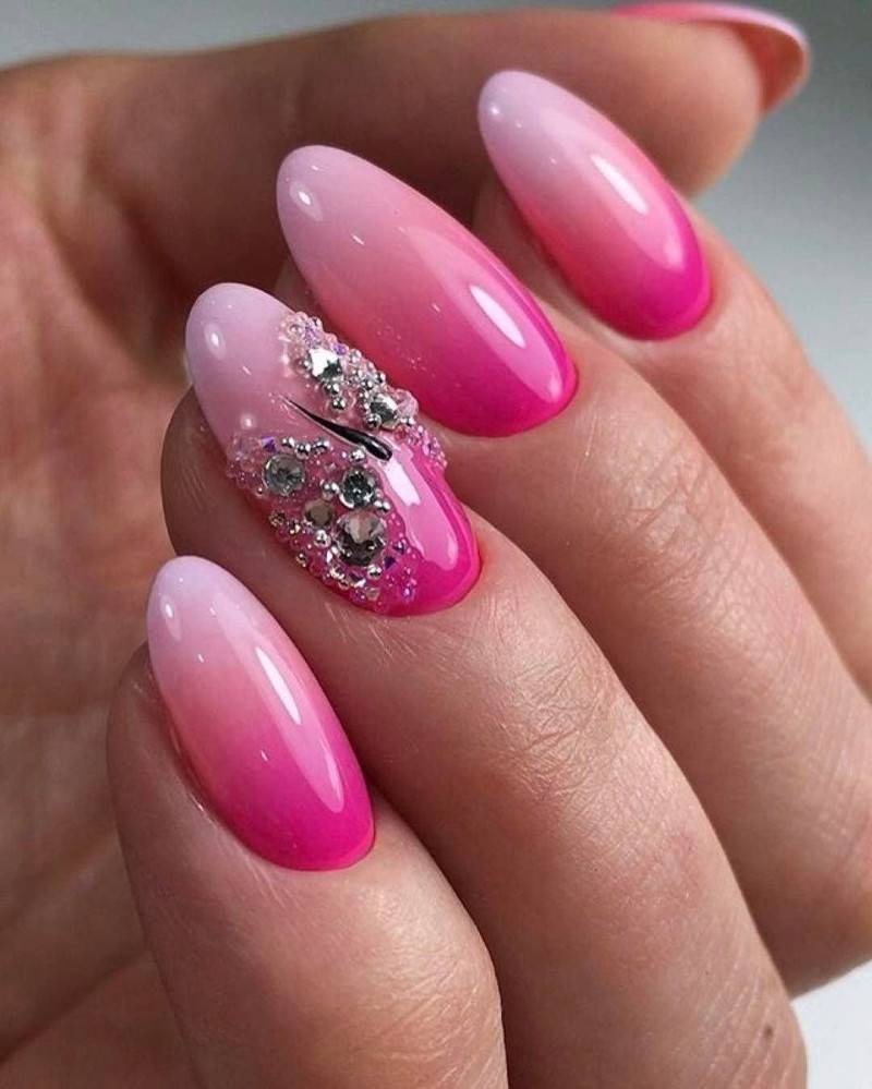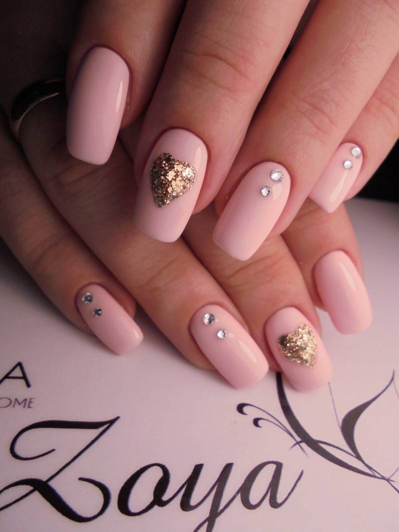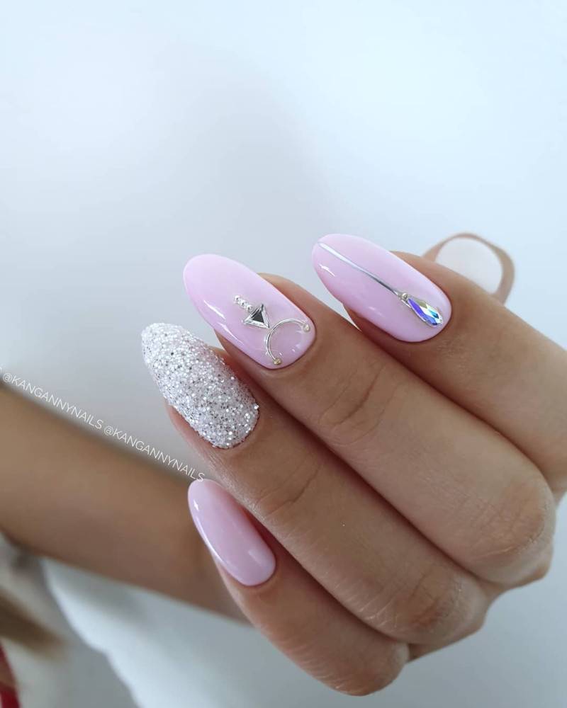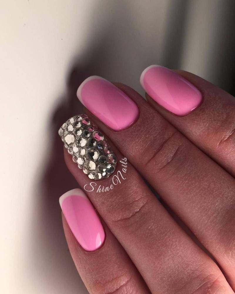 Для розового маникюра можно использовать как нежные тона: лиловый, пепельный, персиковый, так и насыщенные оттенки: малиновый, детский розовый и другие. Со всеми оттенками розового блестки и стразы будут выглядеть вполне уместно