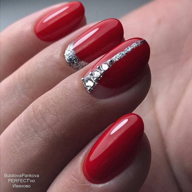 Розовый и красный цвета великолепно смотрятся с блестящим декором. Для маникюра можно использовать серебряный глиттер, конусные и классические стразы, пайетки и другой декор. Что касается золотого глиттера, то с красным и розовым цветом его нужно использовать по-минимуму. Такое сочетание уместно в торжественных образах, при условии сочетания с аксессуарами или платьем.