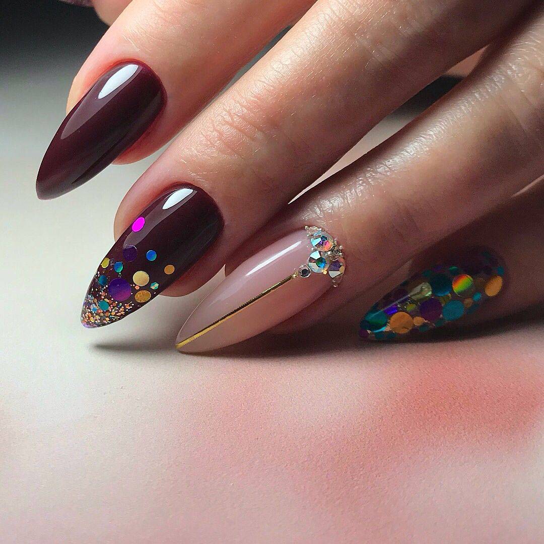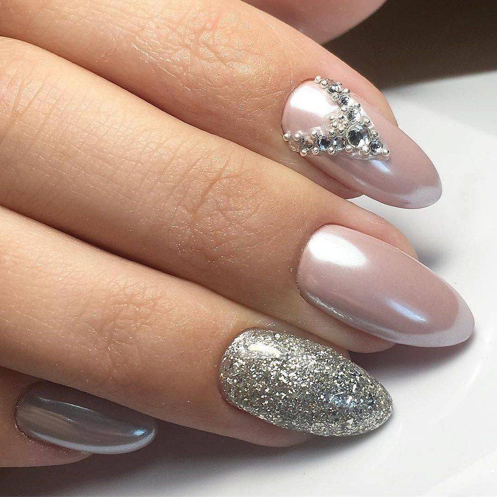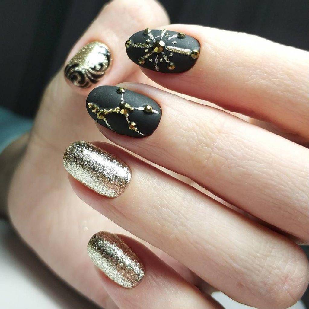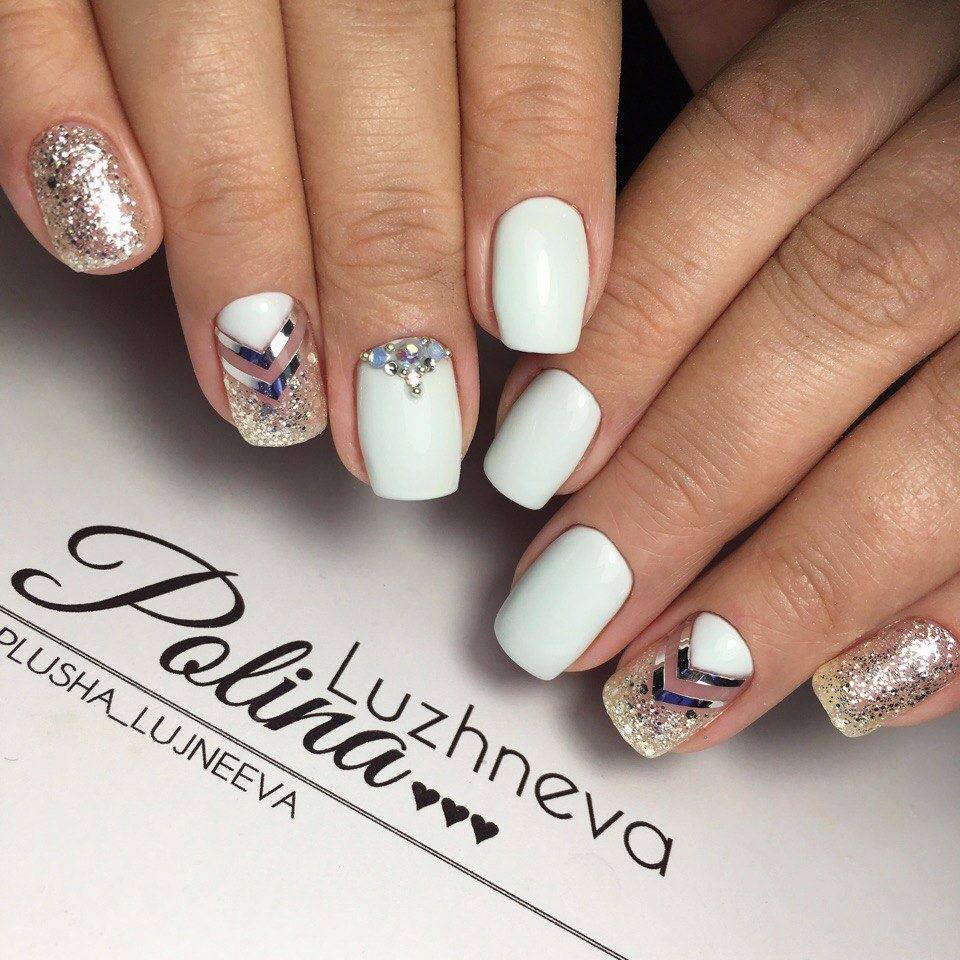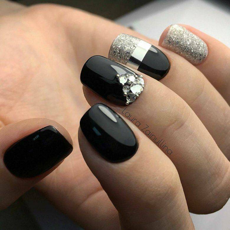 Блестки и стразы — неразлучная пара в маникюре. С их помощью можно создать минималистичный или активный праздничный дизайн ногтей. Чтобы не переборщить с блеском, рекомендуем оформлять стразами один ноготь на руке, а другой полностью покрывать блестками. Остальные ногти лучше оставить без дополнительного декора. такой маникюр будет выглядеть стильно и эффектно, а не пошло и чрезмерно.