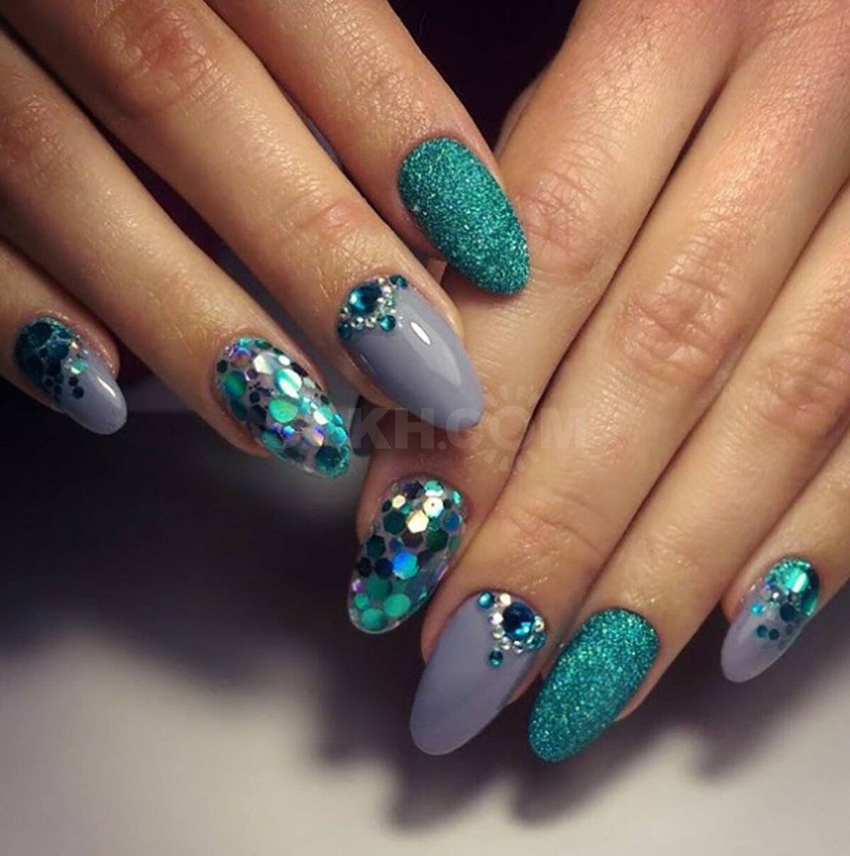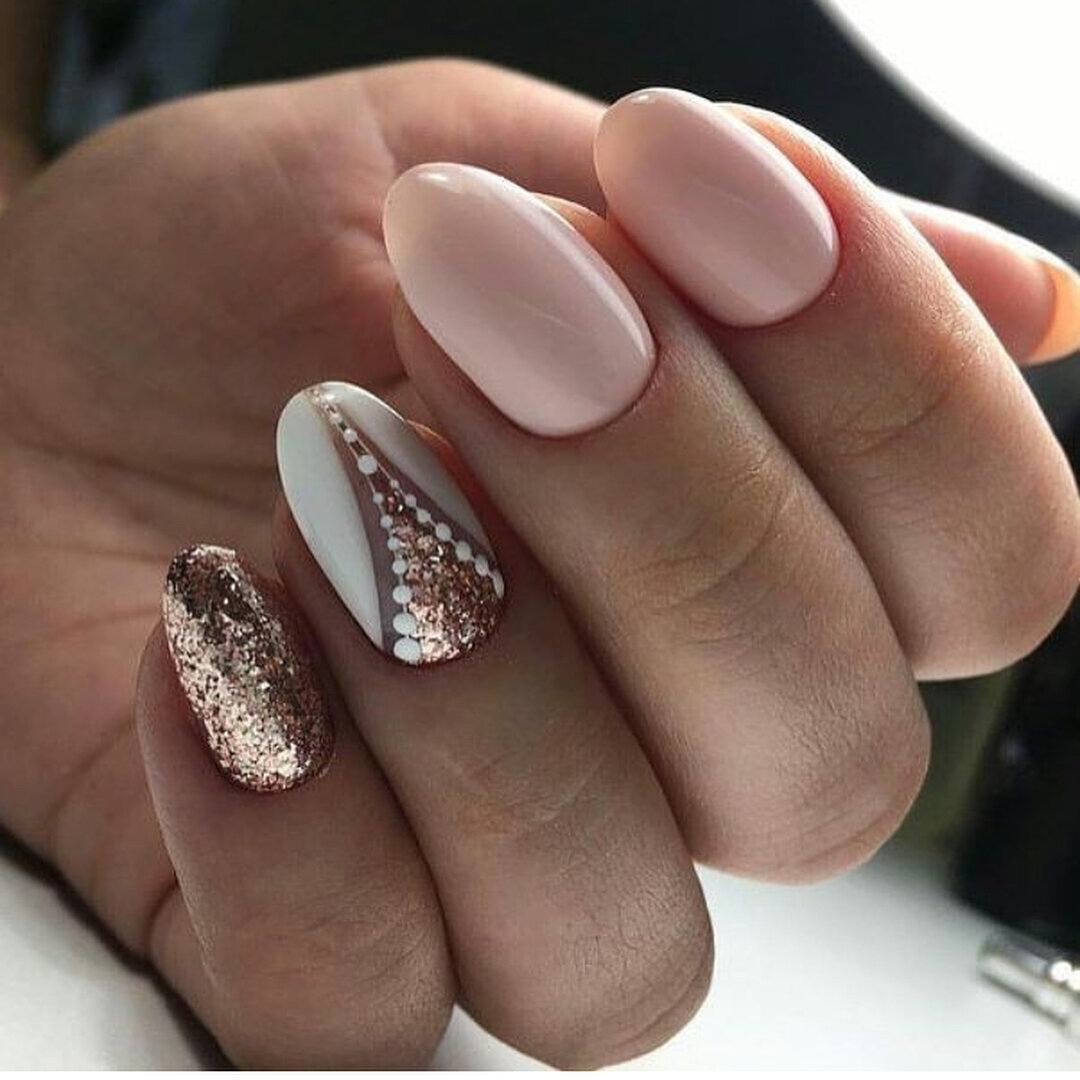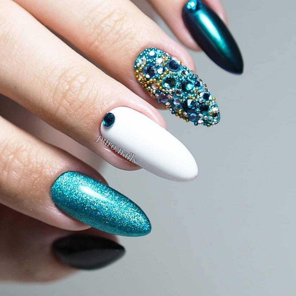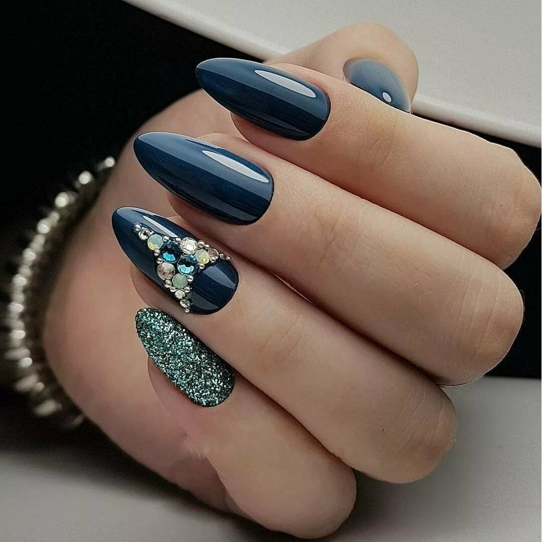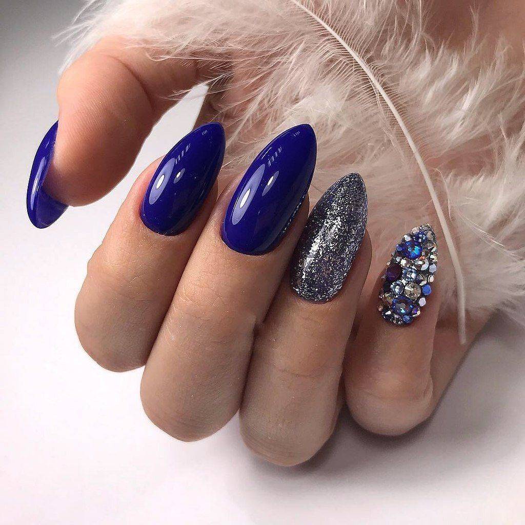 Блестки и стразы — неразлучная пара в маникюре. С их помощью можно создать минималистичный или активный праздничный дизайн ногтей. Чтобы не переборщить с блеском, рекомендуем оформлять стразами один ноготь на руке, а другой полностью покрывать блестками. Остальные ногти лучше оставить без дополнительного декора. такой маникюр будет выглядеть стильно и эффектно, а не пошло и чрезмерно.