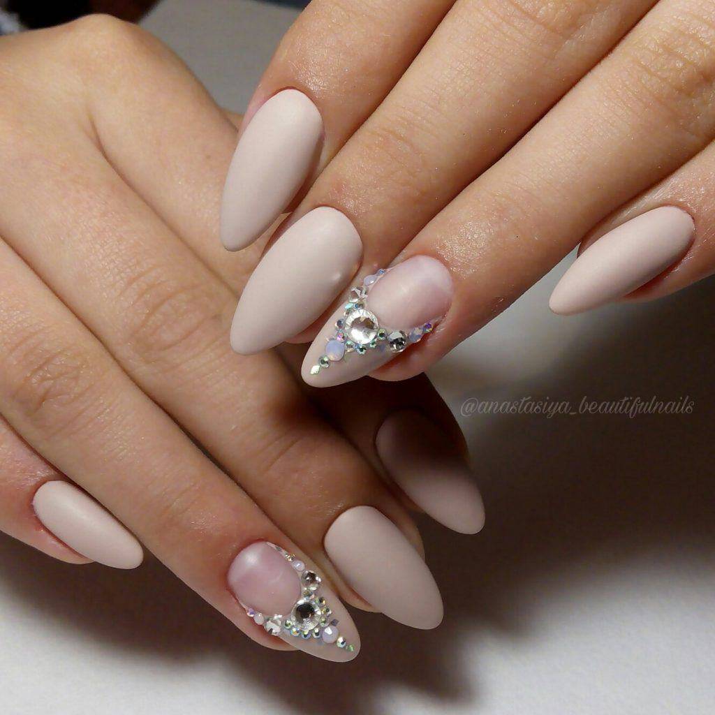 Выразительнее всего матовый маникюр выглядит в темном сочном оттенке — черном, синем, винном, шоколадном. Стразы могут быть контрастными или, наоборот, сочетаться по оттенку с цветом ноготка.