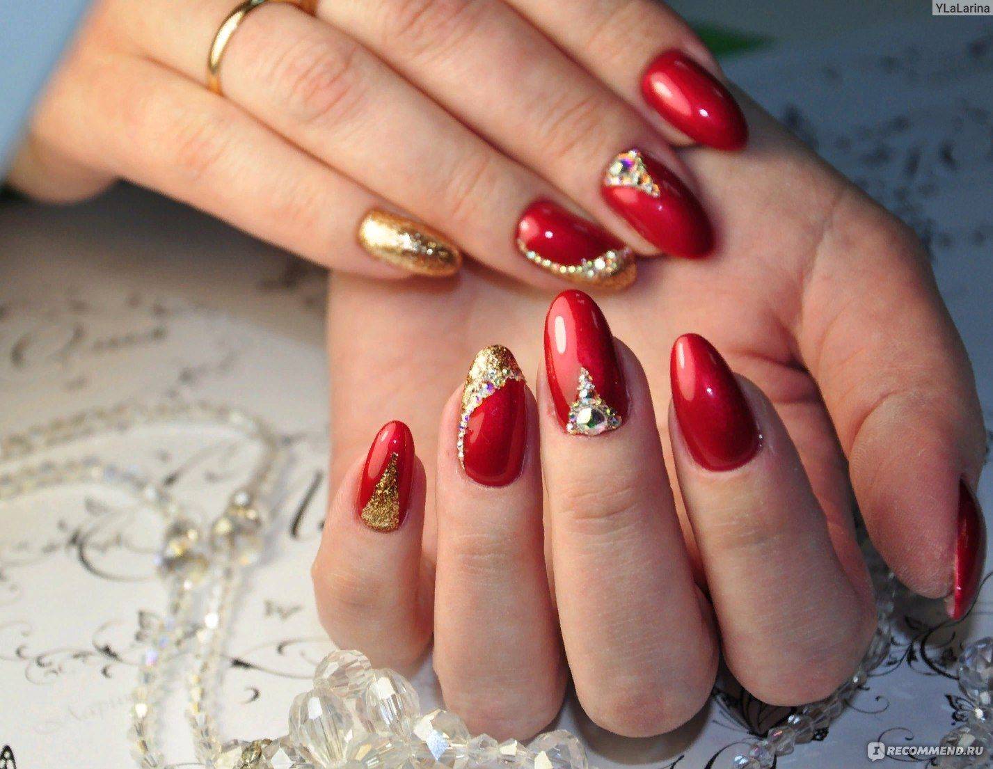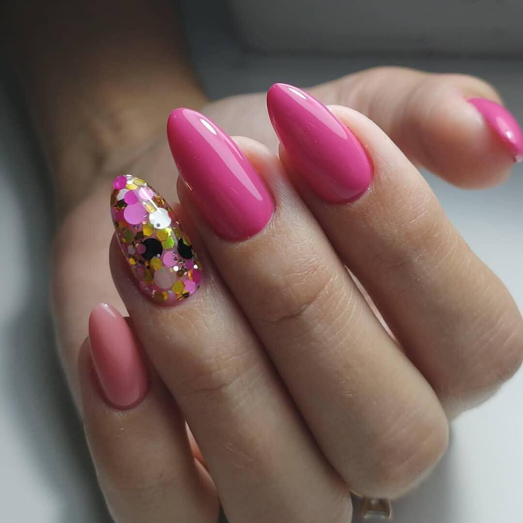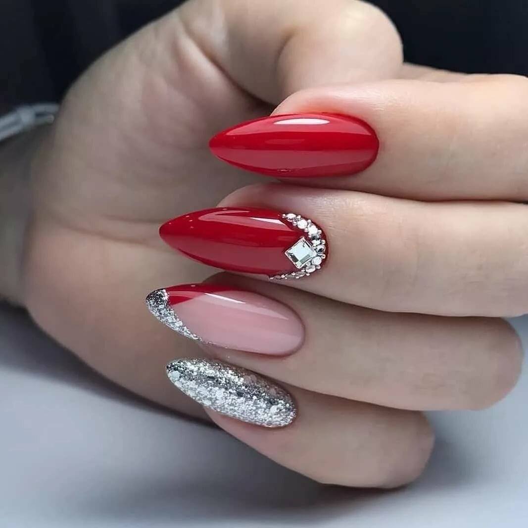 Розовый и красный цвета великолепно смотрятся с блестящим декором. Для маникюра можно использовать серебряный глиттер, конусные и классические стразы, пайетки и другой декор. Что касается золотого глиттера, то с красным и розовым цветом его нужно использовать по-минимуму. Такое сочетание уместно в торжественных образах, при условии сочетания с аксессуарами или платьем.