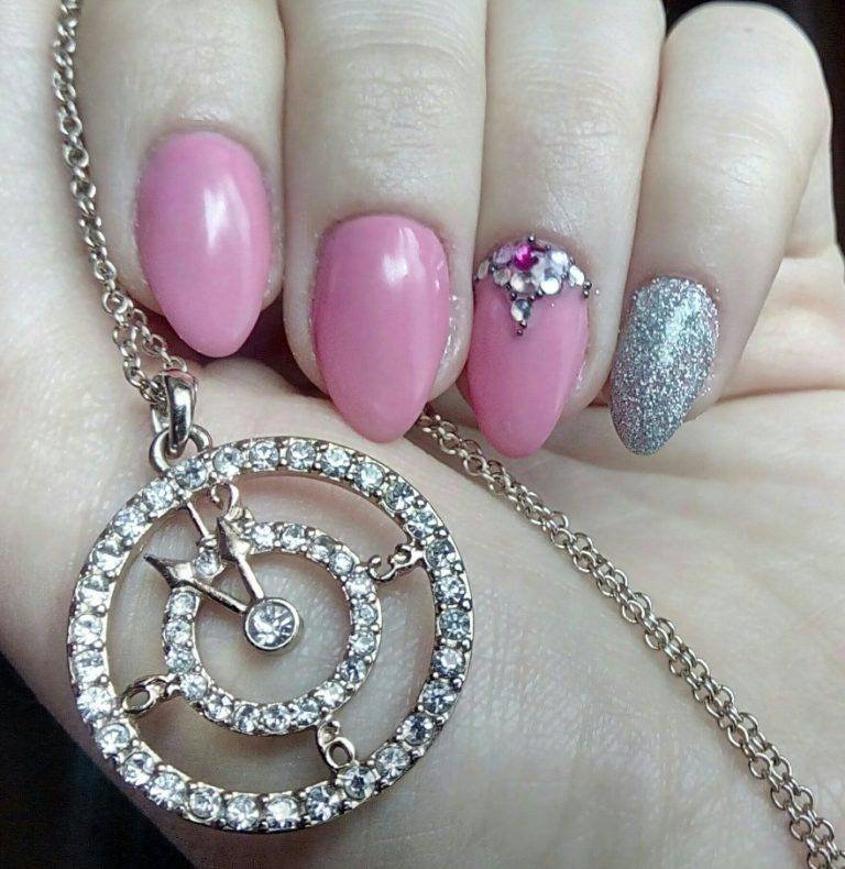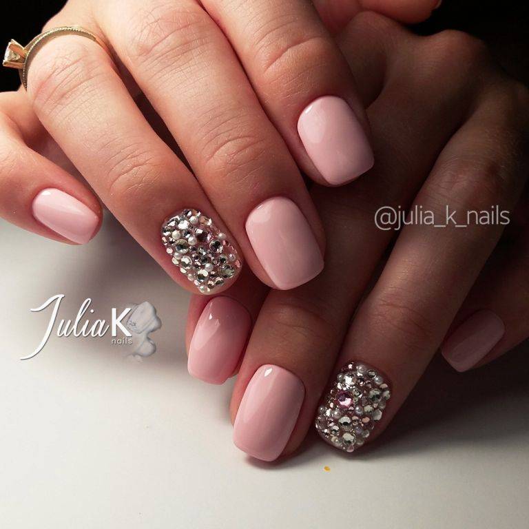 Для розового маникюра можно использовать как нежные тона: лиловый, пепельный, персиковый, так и насыщенные оттенки: малиновый, детский розовый и другие. Со всеми оттенками розового блестки и стразы будут выглядеть вполне уместно