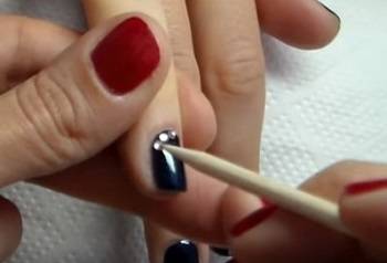 Третий этап – нанесение страз. Сначала в местах крепления камней наносят капли клея или прозрачного лака. Если узор сложный, на ногтевую пластину предварительно наносят узор.