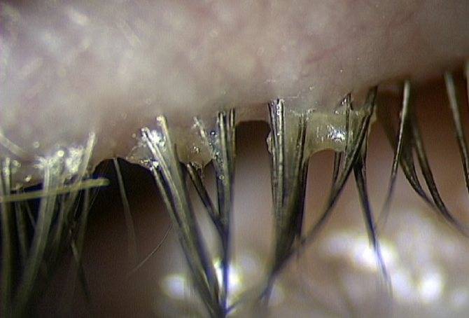 - Обнаружить гнид на ресницах можно даже при ощупывании, натыкаясь на своеобразные узелки (как располагаются гниды на ресницах можно увидеть на фотографии).