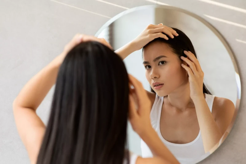 - Алопеция андрогенетическая вызывает истончение или выпадение волос по рядку волос (пробор). Возникает в результате повышения мужских гормонов в организме у женщины.