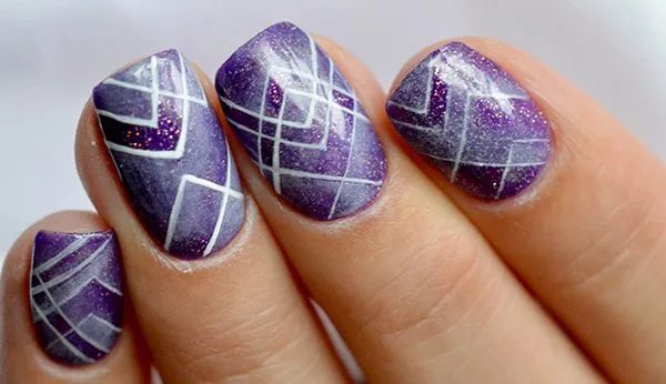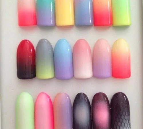 Второй по популярности дизайн – это омбре. Можно не просто совершать переходы от одного цвета к другому, но делать замысловатые узоры. Для этого прибегают к помощи трафаретов, которые идут в наборе или делают их самостоятельно (но нужно обладать художественными навыками).
