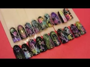 Затем трафарет снимается и мастер может переходить к следующему ногтю или же продолжать прорабатывать текущий. После завершения работы над ногтем его нужно покрыть глянцевым материалом из набора.