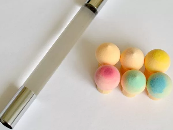 - Чтобы спонжами было удобно пользоваться, в наборе представлены ручки (стилусы), к которым они крепятся. Они двухсторонние. Это значительно сокращает время для нанесения рисунка, если у мастера под рукой сразу несколько цветов.