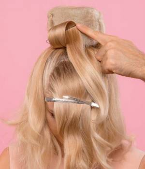 - Верхнюю часть волос накрутите на крупные щипцы (делать это следует по направлению назад), то же самое проделайте с оставшимися прядями.