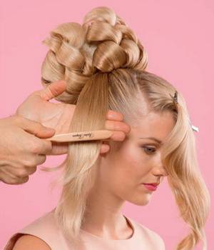 - Начесываем волосы теменной зоны, придавая им объем у корня. Вычесываем волосы, создавая форму по направлению от лица и немного набок.