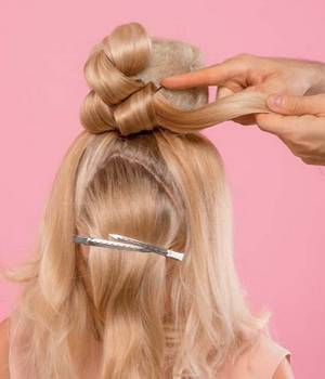 - Верхнюю, а также нижнюю прядь нужно, завернув за края кольца, закрепить таким образом, чтобы бублик держался на голове.