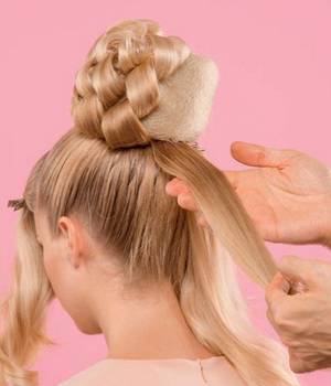 При помощи бублика можно добиться требуемого объема пучка, придать прядкам утонченный узор его оплетением. Такая укладка будет изысканной и эффектной, но потребует больше времени на исполнение, определенных навыков мастерства.