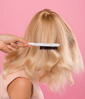 - На свежевымытые влажные волосы наносим средство для создания объема у корней и равномерно распределяем его по всей массе волос.