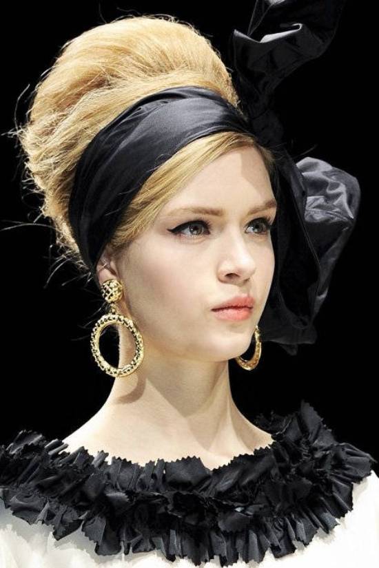 Дизайнеры мира давно используют начёсы для своих показов. Почему бы не сделать изысканную причёску, как с подиума? Только в этом случае волосы нужно будет усиленно начесать, подобрать длину и зафиксировать шпильками. Кончики волос спрятать в полученный объёмный пучок. Акцент должен идти на бант или повязку. Наденьте красивые серьги, и вы королева вечера!