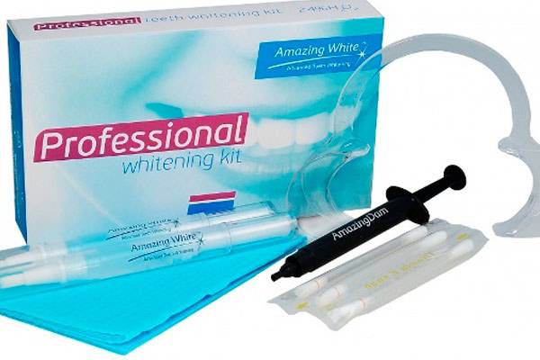 - Профессиональный. В этом случае применяют 25 % перекись. Большая концентрация действующего вещества приводит к осветлению эмали на 8 тонов и более.