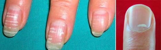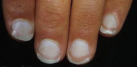 Результатом внутренних заболеваний могут быть не только точки или полоски белого цвета, но также тотальное поражение ногтя. Причем, лейконихия появляется на верхних и нижних конечностях.