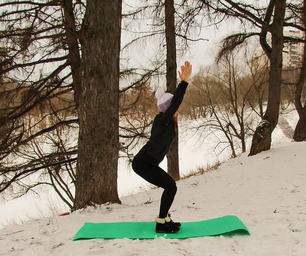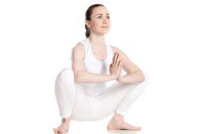 5. Гарудасана. Представляет собой “скручивающуюся”асану, прорабатывающую бедра и все мышцы конечностей. Выполняется отдельно для каждой ноги после нескольких спокойных циклов дыхания. Необходимость балансировать в процессе ее выполнения учит находить равновесие, а также позволяет укрепить сердечную мышцу.