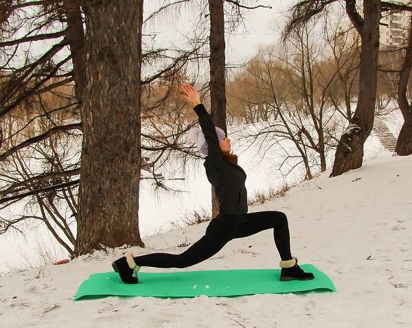 Для выполнения позы воина станьте прямо, сделайте выпад вперед, руки соедините ладонями и поднимите над головой. Выполните легкий прогиб назад и натяните всё тело. Повторите упражнение с выпадом на другую ногу.