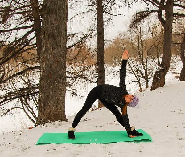 Поза треугольника работает на сжигание жиров в боковых частях тела, успокаивает нервную систему и растягивает сухожилия ног.