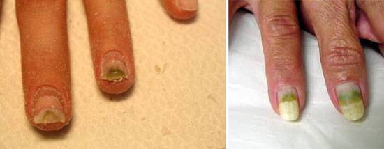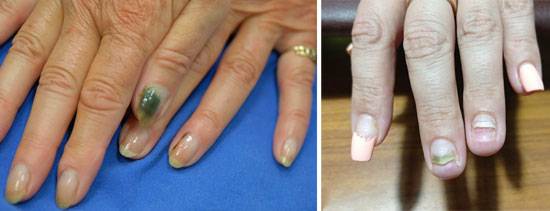- Иногда зеленую окраску ногти приобретают при микротравмах.