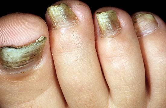 Рис. 39. На фото поражение ногтей плесневыми грибами рода аспергилл. При заболевании чаще поражаются ногти первых трех пальцев ног. Они приобретают зеленую окраску, а на их поверхности появляются белесоватые пятна или полосы. Со временем сама поверхность становится мягкой, мучнистой и рассыпчатой.