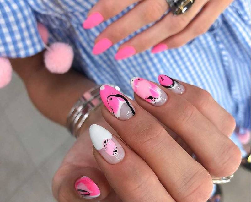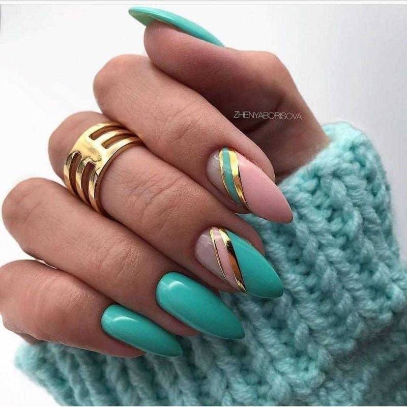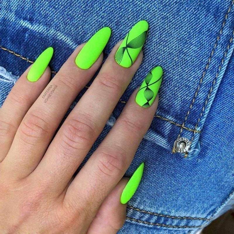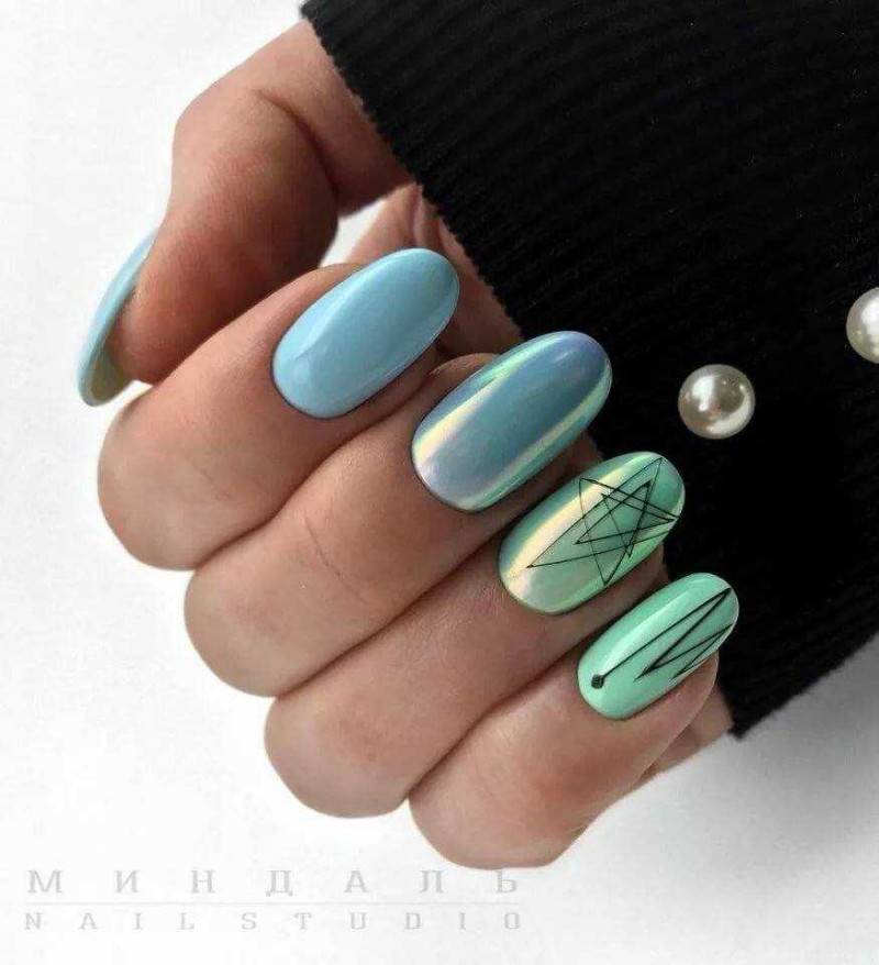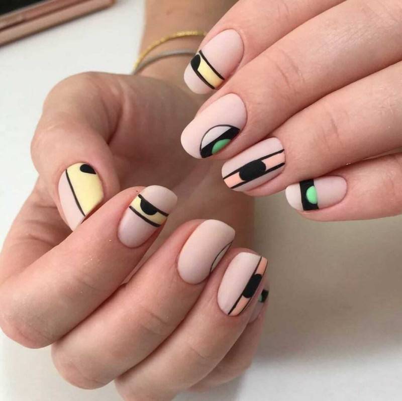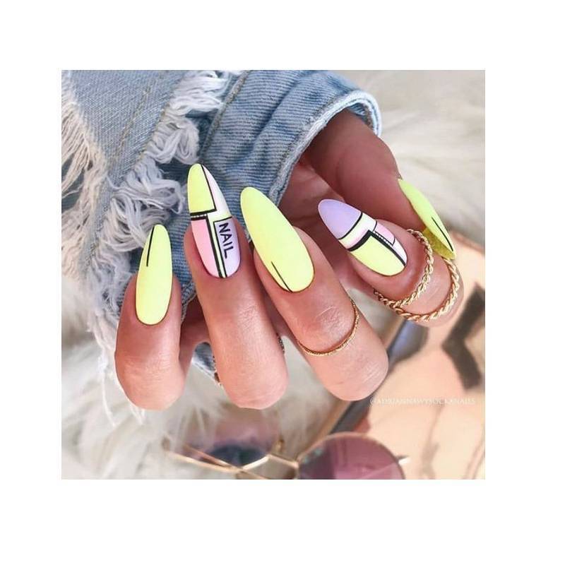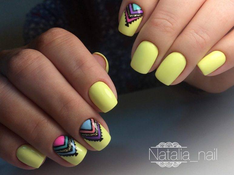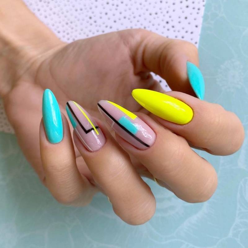 Пастельный и неоновый маникюр — можно выбирать любые комбинации. Главное — чтобы сам оттенок был подходящим для формы. Геометрические узоры любых разновидностей тоже смотрятся привлекательно.