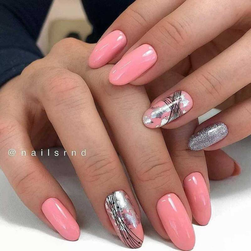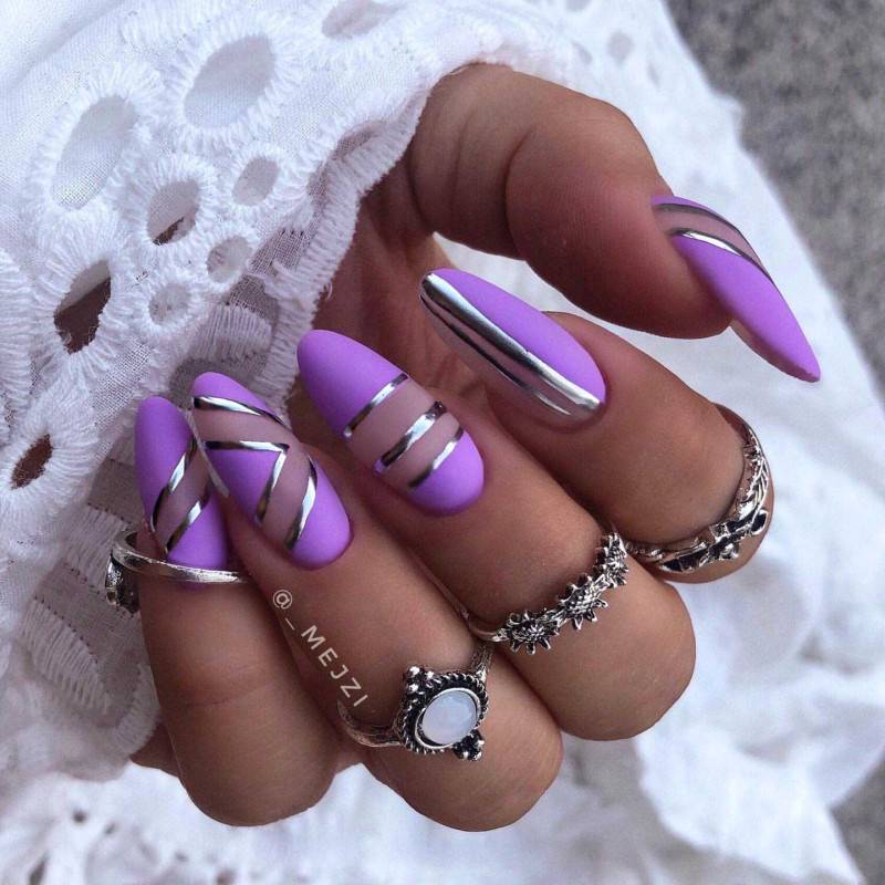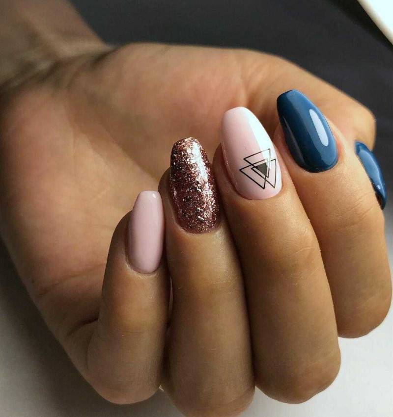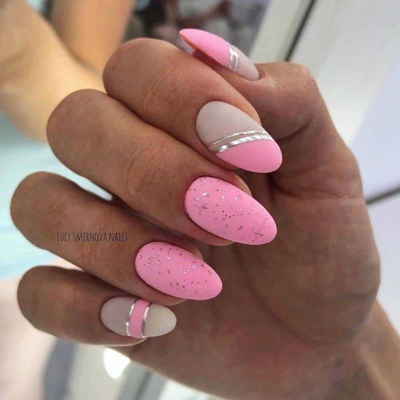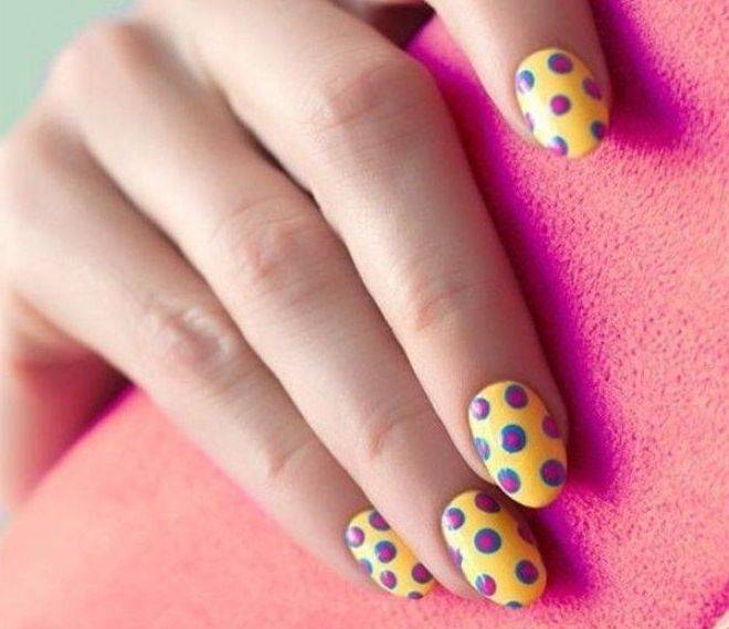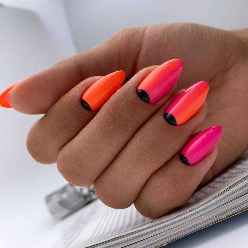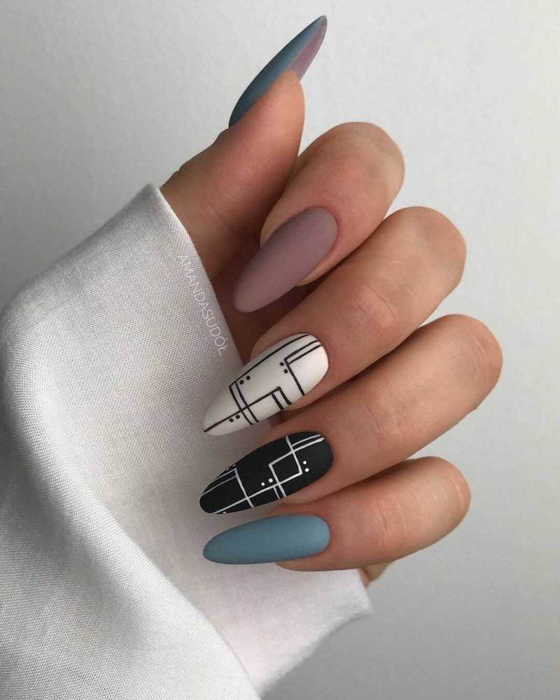 Пастельный и неоновый маникюр — можно выбирать любые комбинации. Главное — чтобы сам оттенок был подходящим для формы. Геометрические узоры любых разновидностей тоже смотрятся привлекательно.