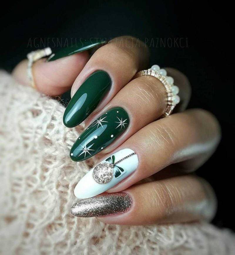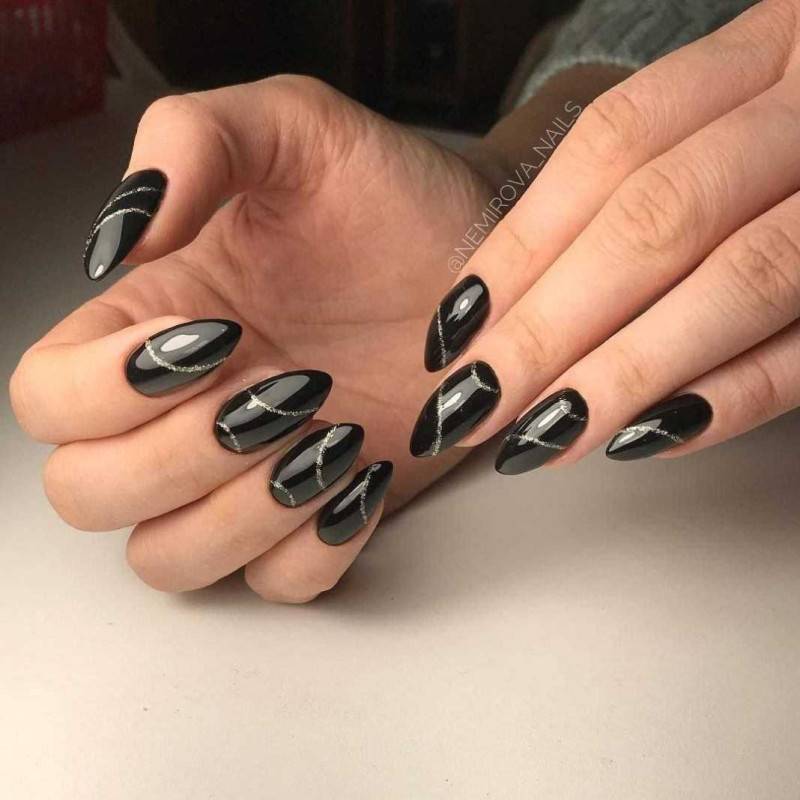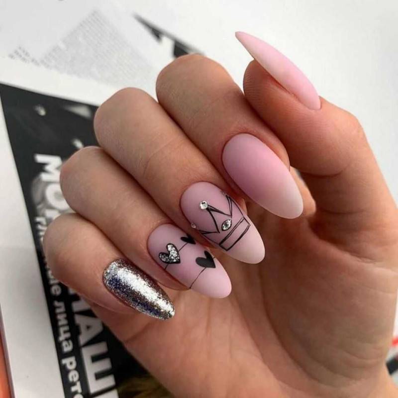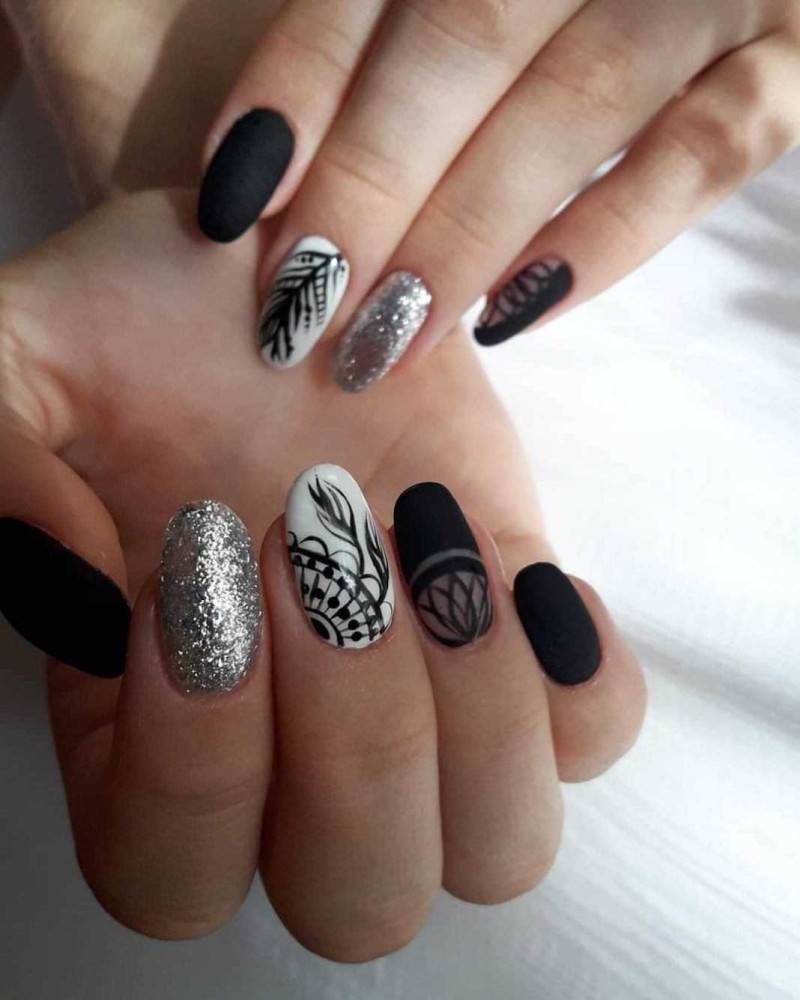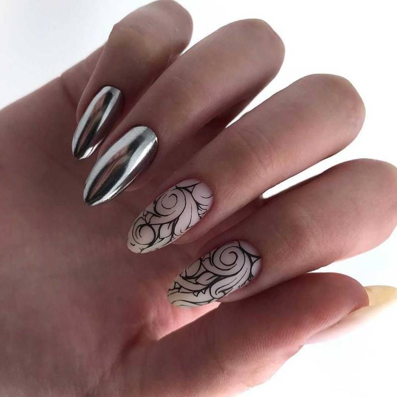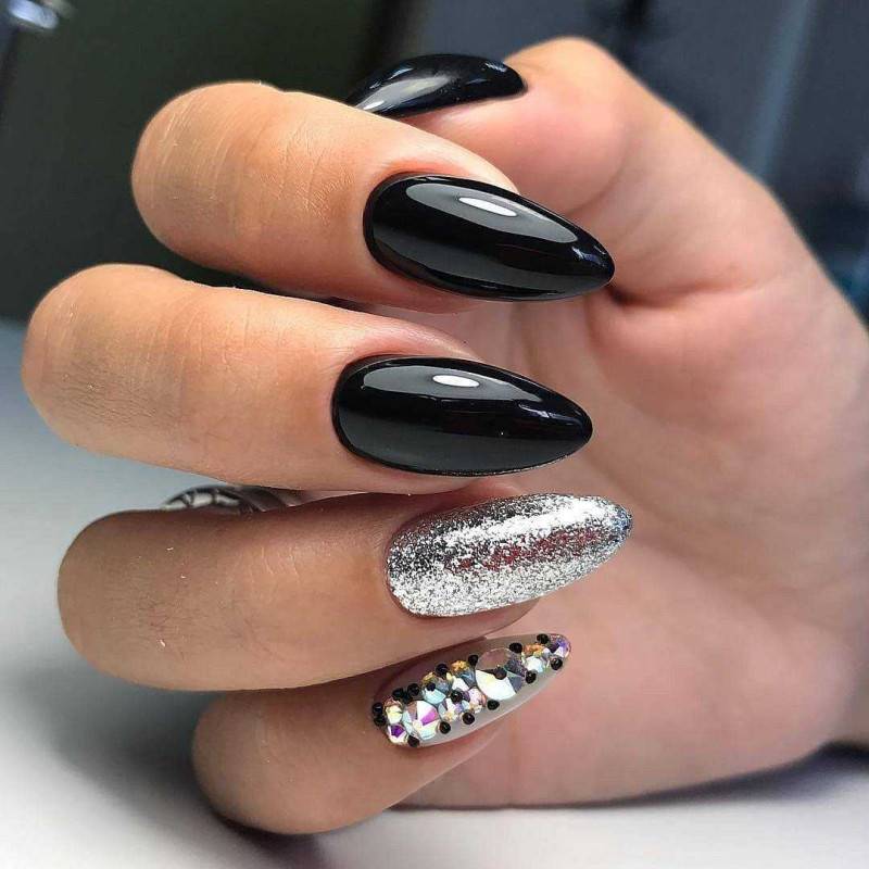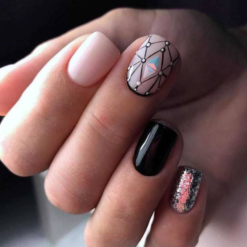 Еще более выигрышно будет смотреться сочетание блеска и контрастного рисунка в одном маникюре.