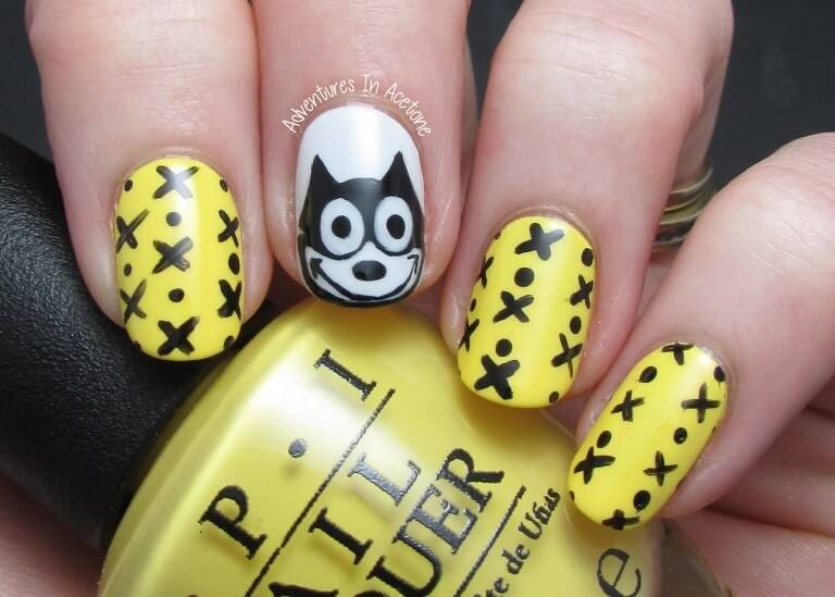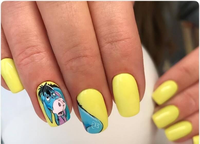 Рисунки – сочные фруктики или герои из мультфильмов это явно желтая тема или ноготки с цветами, например, ромашками.