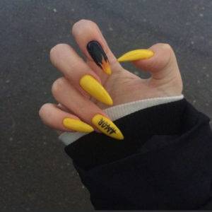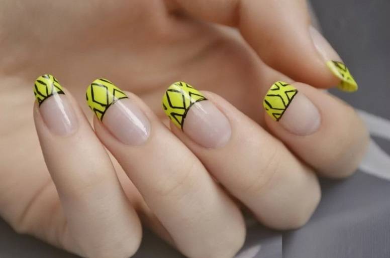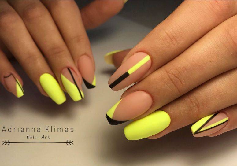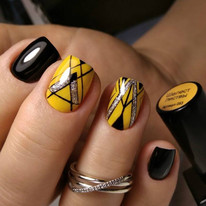 Сочетание желтого французского маникюра с черным минимализмом или абстракцией, выглядит строго, но притягательно.