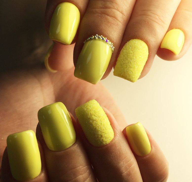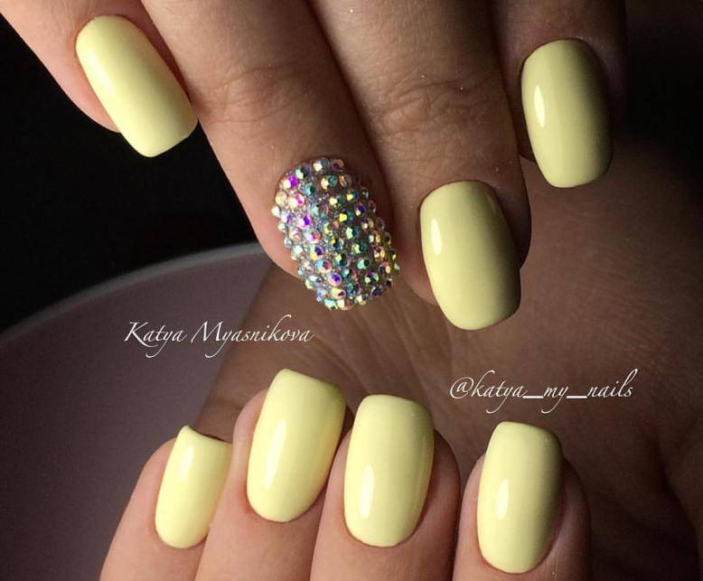 Стразы и блестки в дизайн желтых ногтей (фото) будут смотреться весьма органично. Пожалуй, желтый цвет, наряду с черным и красным, это один из самых идеальных фонов для блеска. Он выгодно подчеркивает блестящий декор, будь то теплый или холодный блеск.