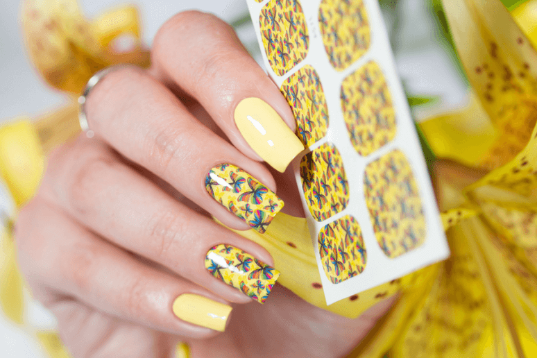 Это самый простой и доступный способ создания 3D-маникюра. Наклейки не имеют рельефного тиснения, как дизайн, и не будут сильно заметны на ногтевой пластине. Наклейки с растительными мотивами, фруктами, абстрактными рисунками, надписями и графическими изображениями часто сочетаются с желтым.