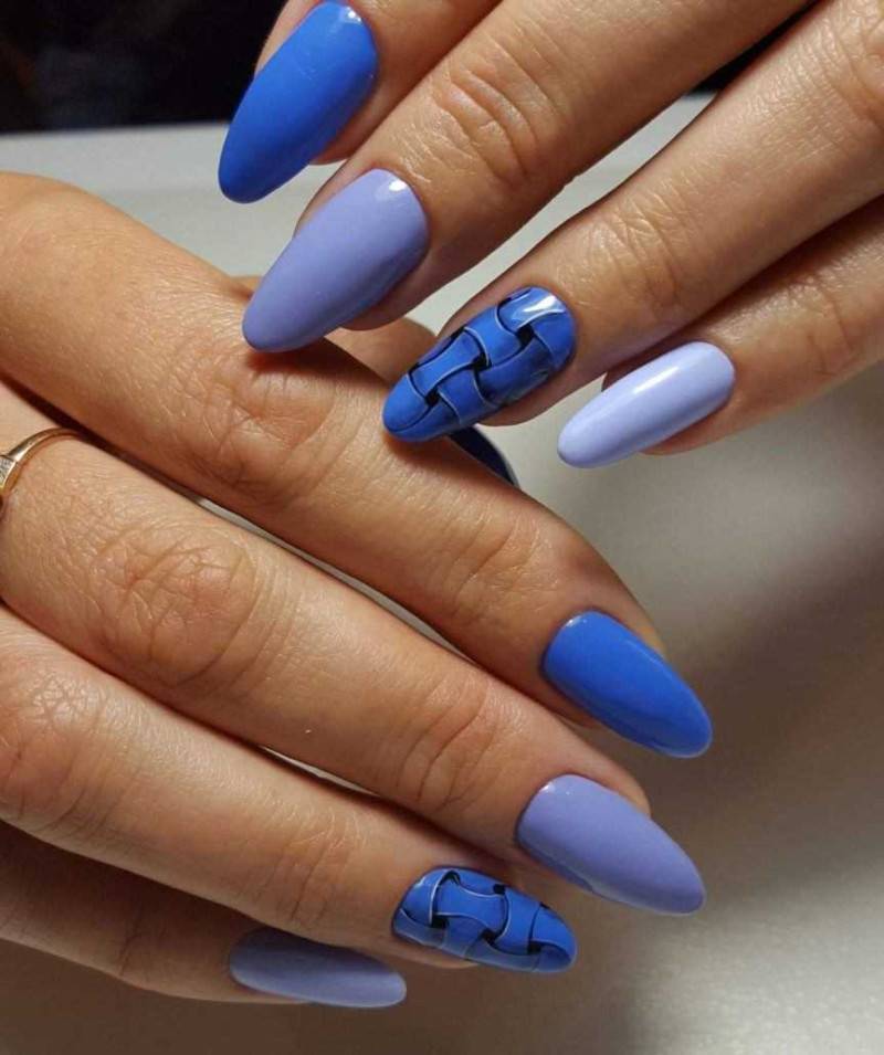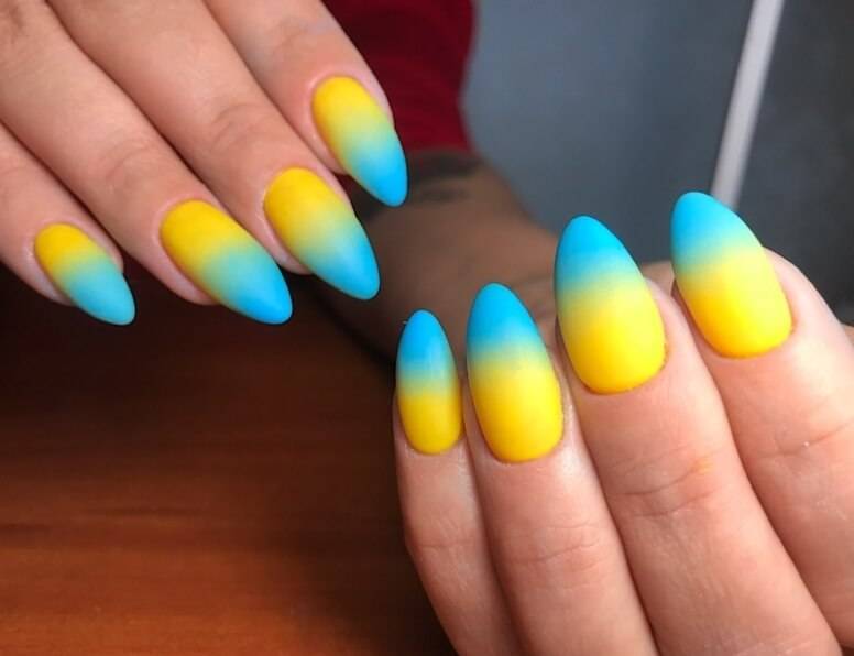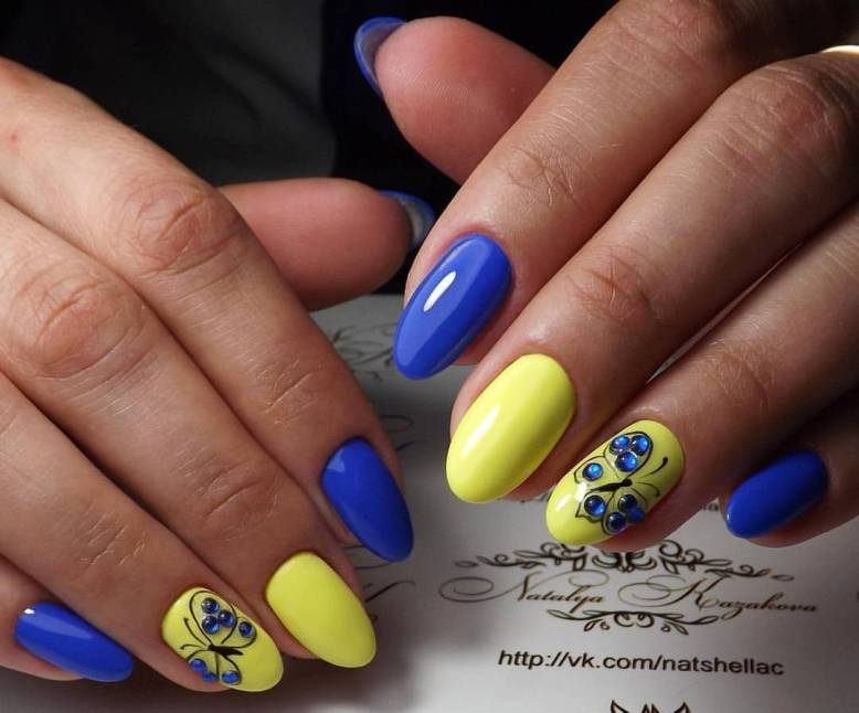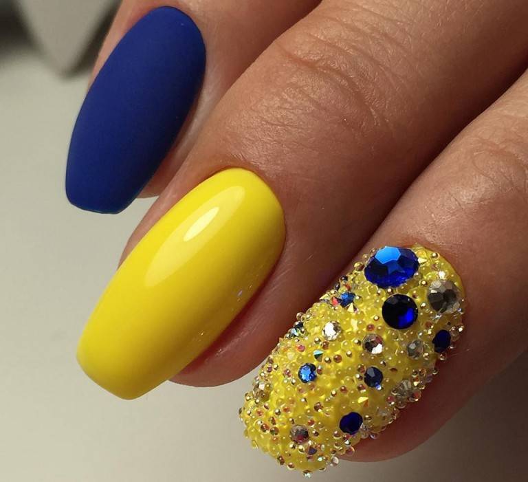 Многие боятся сочетания с синим, но зря. Синий и желтый цвета, интересно дополняют друг друга, особенно если грамотно выбраны тона. Глянцевые синие ноготки с матовыми желтыми или, наоборот, на мой взгляд, очень завлекательно.