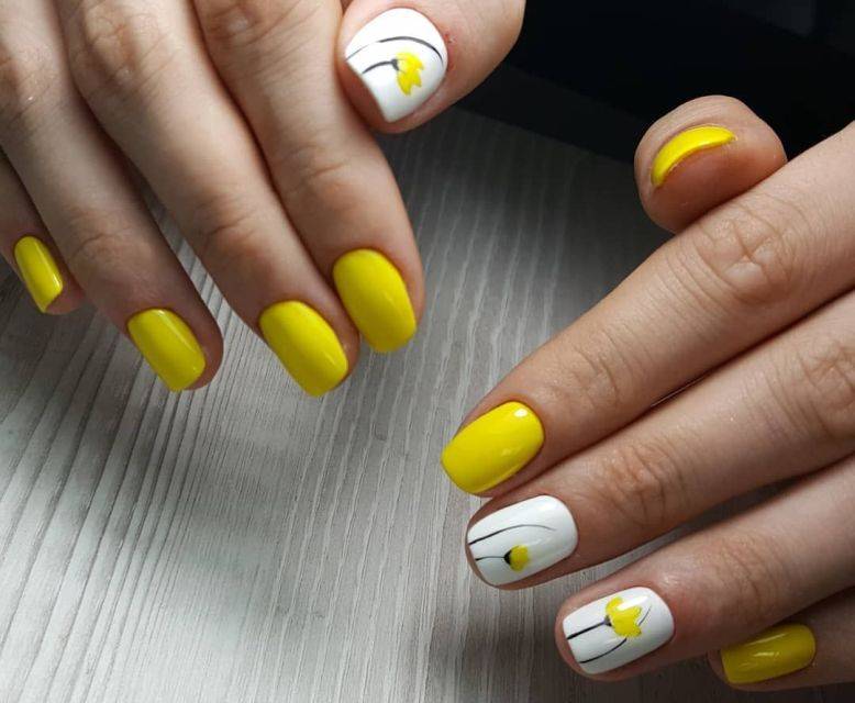 С белым. Лимонный и белый – самые популярные «соседи» среди цветовых сочетаний. В этом сезоне редкая модница удержится от соблазна создания такого арта в самых модных тенденциях.